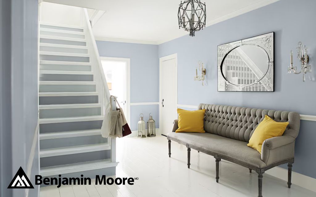 Pour un effet plus dynamique, alternez deux couleurs sur les contremarches. Par exemple, reprenez une couleur déjà présente dans le décor, tel que teinte Gris Plume 2127-60 du mur du couloir sur l’escalier, et alterner avec Poussière d’Étain 2127-50, un bleu-gris subtil. Terminer l’harmonie sur les moulures et les pas en les recouvrant de Blanc Neige OC-66, un blanc froid.